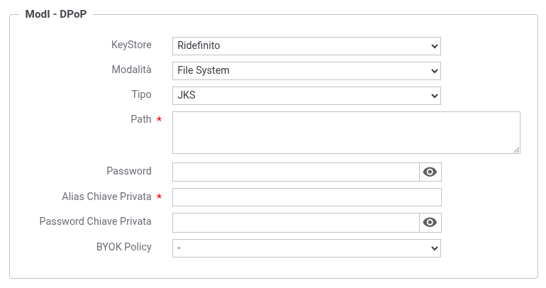 Se la sottosezione DPoP è abilitata, verrà utilizzato il keystore ivi definito per la firma della DPoP proof;