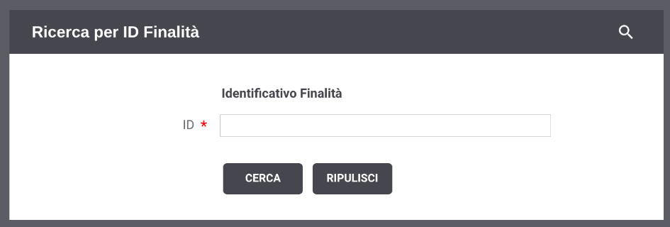 La modalità ID Finalità consente di effettuare ricerche di transazioni specificando un determinato identificativo di finalità utilizzato all’interno del voucher PDND nel campo purposeId. La maschera di ricerca si compone dei seguenti campi (Fig. 547):