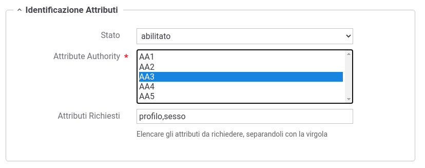 Una volta abilitata la funzionalità, se viene selezionata un’unica Attribute Authority sarà possibile indicare quali attributi qualificati debbano essere recuperati indicandoli nel campo “Attributi Richiesti”, separandoli con la virgola, come riportato nell’esempio in Fig. 77.