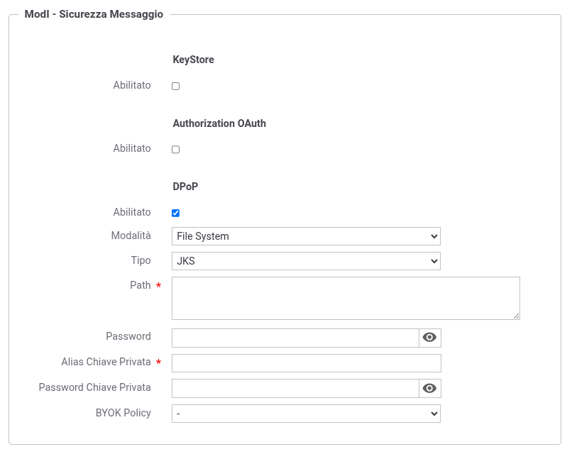 Se la sottosezione DPoP non è abilitata, verrà utilizzato il keystore principale definito nella sezione KeyStore dell’applicativo.