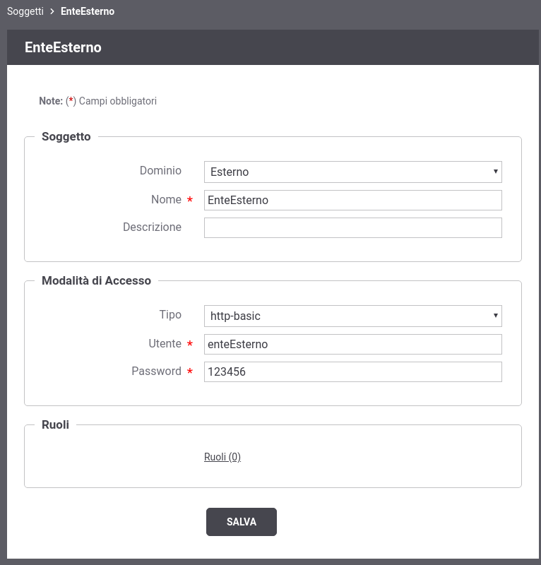Accedere al soggetto EnteEsterno creato in precedenza durante l’esempio descritto nella sezione Fruizione API e associargli delle credenziali “http basic” come ad esempio un username enteEsterno ed una password 123456 (Fig. 1020).
