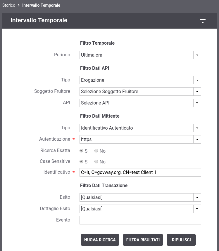 Sempre attraverso la console govwayMonitor è possibile ricercare tutte le transazioni che sono transitate sul gateway relative ad uno specifico certificato client. Per farlo si deve modificare i parametri relativi alla sezione “Filtro Dati Mittente” presenti nel filtro di ricerca dello storico delle transazioni indicando: